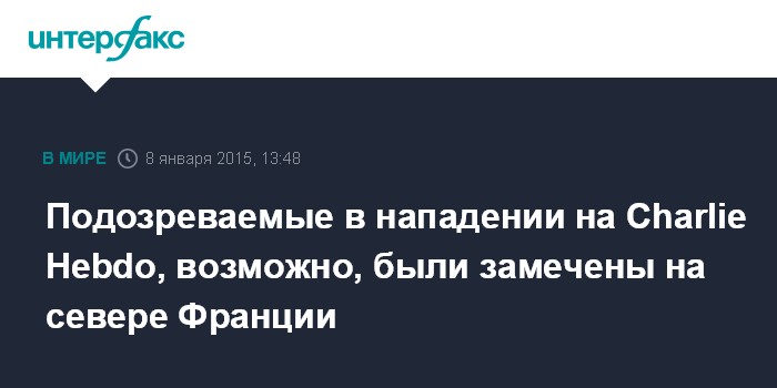 Москва. 8 января. INTERFAX.RU - Люди, предположительно напавшие на редакцию еженедельника Charlie Hebdo, были замечены в департаменте Эна на севере Франции, пишет в четверг газета "Паризьен".
