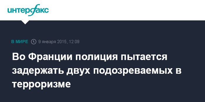 Москва. 9 января. INTERFAX.RU - Французские полицейские ведут преследование двух подозреваемых в террористических преступлениях к северу от Парижа, передают в пятницу местные СМИ со ссылкой на источник в правоохранительных органах.