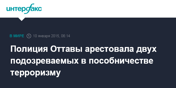 Москва. 10 января. INTERFAX.RU - В пятницу полиция Оттавы арестовала двух местных жителей, предъявив им ряд обвинений по связанным с терроризмом статьям, говорится в сообщении на официальном сайте Королевской канадской конной полиции (КККП).