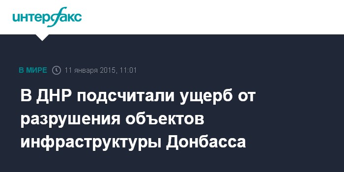 "С начала боевых действий мы ведем статистику по поврежденным объектам инфраструктуры на территории республики. Общий ущерб по итогам 2014 года составил порядка 1,3 млрд гривен (более 4,6 млрд рублей - ИФ), повреждено и разрушено более 7,2 тыс. объектов инфраструктуры", - приводит слова Морозовой Донецкое агентство новостей.