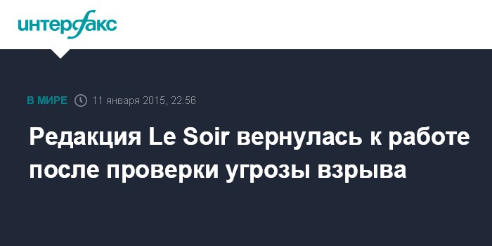 Москва. 11 января. INTERFAX.RU - Сотрудники редакции брюссельской газеты Le Soir, которой "телефонный террорист" угрожал взрывом, вечером в воскресенье смогли вернуться на свои рабочие места, сообщил интернет-сайт телерадиоканала RTBF.