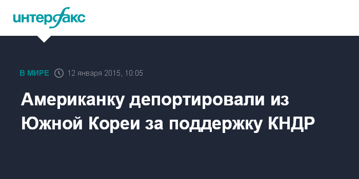 Москва. 12 января. INTERFAX.RU - Гражданку США южнокорейского происхождения депортировали на родину из Южной Кореи за поддержку Северной Кореи, сообщили в понедельник официальные лица в Сеуле.