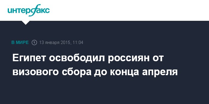 Москва. 13 января. INTERFAX.RU - Египетские власти отменили визовый сбор для россиян начиная с четверга, 15 января, сообщило издание "Аль-Яум ас-Сабиа". Таким образом, россияне не должны будут платить визовый сбор $25 до 30 апреля 2015 года.