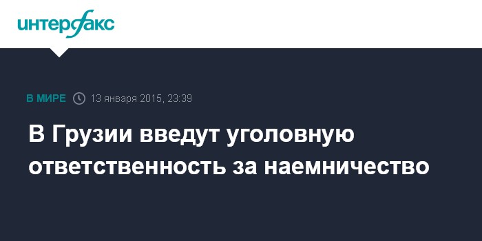 Москва. 13 января. INTERFAX.RU - Гражданам Грузии, которые отправляются за рубеж с целью участия в войнах и вооруженных конфликтах в рядах незаконных вооруженных формирований, будет грозить на родине наказание в виде лишения свободы.