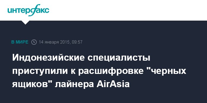 Москва. 14 января. INTERFAX.RU - Власти Индонезии приступили к расшифровке данных "черных ящиков" с самолета малайзийской авиакомпании AirAsia, потерпевшего крушение в декабре прошлого года, и надеются добиться результата уже в ближайшие дни, сообщила в среду газета South China Morning Post.