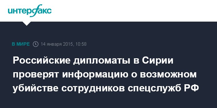 Москва. 14 января. INTERFAX.RU - Посольство России в Дамаске проверяет информацию о казни исламистами в Сирии двух мужчин, которые, предположительно, являются сотрудниками российских спецслужб.
