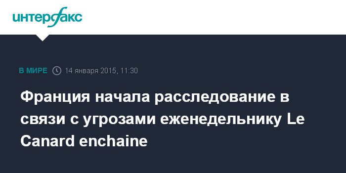 Москва. 14 января. INTERFAX.RU - Судебные власти Франции инициировали расследование угроз, полученных сатирической газетой-еженедельником Le Canard enchaine ("Канар аншене"), сообщает в среду парижское изданияе Le Parisien.