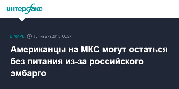 Москва. 15 января. INTERFAX.RU - Введенные Россией в качестве ответной меры на западные санкции ограничения на поставки ряда продуктов питания из США и ЕС могут оставить американских и европейских астронавтов на Международной космической станции (МКС) без еды, сообщили в четверг "Интерфаксу" в российской ракетно-космической отрасли.