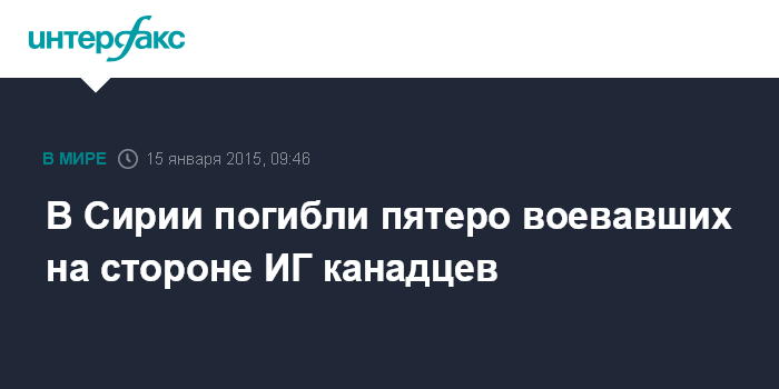 Москва. 15 января. INTERFAX.RU - Пятеро канадцев, воевавших на стороне "Исламского государства" (ИГ), были недавно убиты в Сирии, сообщают в четверг канадские СМИ.