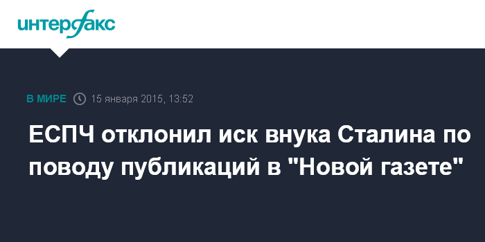 Москва. 15 января. INTERFAX.RU - В ЕСПЧ сочли правильным решение российских судебных властей отклонить иски внука Иосифа Сталина Евгения Джугашвили, связанные с публикациями в российском издании "Новая газета", говорится в распространенном в четверг пресс-релизе суда.