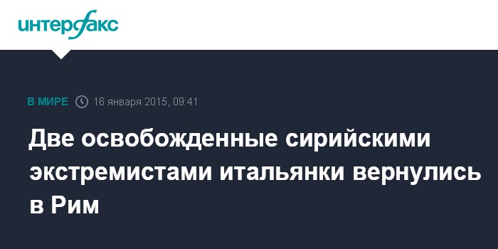 Москва. 16 января. INTERFAX.RU - Гражданки Италии Грета Рамелли и Ванесса Мардзулло, освобожденные из плена сирийскими экстремистами, в ночь на пятницу прилетели в Рим, сообщает итальянское телевидение.