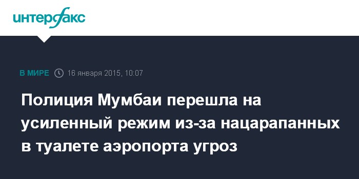 Москва. 16 января. INTERFAX.RU - Полиция в Мумбаи переведена на усиленный режим работы из-за подозрительных надписей, обнаруженных в мужских туалетах местного аэропорта, сообщает в пятницу индийский телеканал NDTV.
