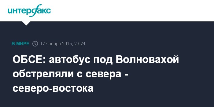 Москва. 17 января. INTERFAX.RU - По блокпосту в Волновахе (Украина), где в результате попадания снаряда в автобус погибли 12 человек, стреляли из ракетной установки с севера или северо-востока, говорится в отчете Специальной мониторинговой миссии (СММ) ОБСЕ.