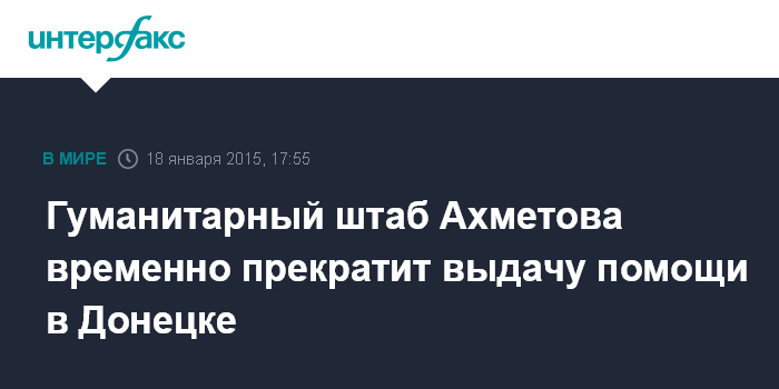 Москва. 18 января. INTERFAX.RU - Гуманитарный штаб Рината Ахметова принял решение с понедельника приостановить работу пунктов выдачи всей гуманитарной помощи на стадионе "Донбасс Арена" и в других пунктах выдачи в городе Донецке.