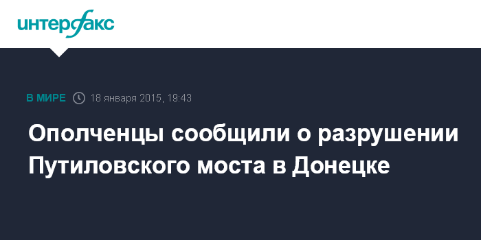 Москва. 18 января. INTERFAX.RU - В Донецке разрушен Путиловский мост, соединяющий Киевский район с дорогой к аэропорту, сообщил "Интерфаксу" в воскресенье вечером представитель командования штаба ополчения.