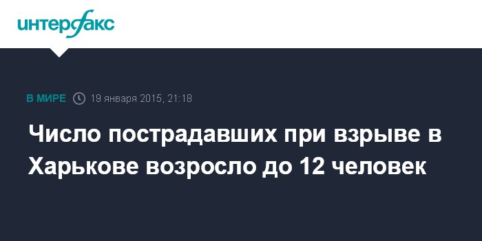 Москва. 19 января. INTERFAX.RU - Количество пострадавших в результате взрыва возле Московского районного суда Харькова увеличилось до 12 человек, сообщил агентству "Интерфакс" первый замначальника ГУ МВД Украины в Харьковской области Василий Остропилец.