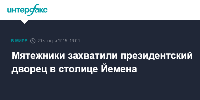 Москва. 20 января. INTERFAX.RU - Шиитские мятежники во вторник захватили президентский дворец в столице Йемена, сообщает агентство EFE.