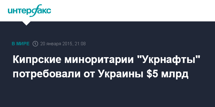 Москва. 20 января. INTERFAX.RU - Три кипрские компании - миноритарные акционеры ПАО "Укрнафта" требуют от Украины $5 млрд в качестве компенсации за действия правительства и НАК "Нафтогаз Украины".