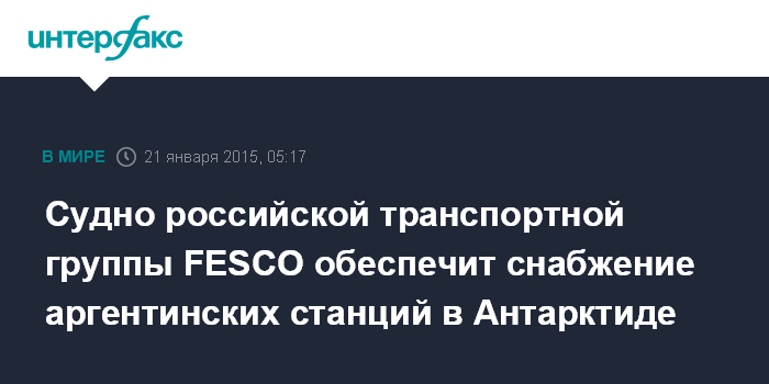 Москва. 21 января. INTERFAX.RU - Дизель-электроход "Василий Головнин" ОАО "Дальневосточное морское пароходство" (ДВМП, базовая компания транспортной группы FESCO) до середины февраля 2015 года будет обеспечивать снабжение аргентинских научно-исследовательских станций в Антарктиде.