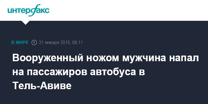 Москва. 21 января. INTERFAX.RU - Вооруженный ножом мужчина напал на пассажиров автобуса в израильском Тель-Авиве, сообщает в среду издание The Jerusalem Post.