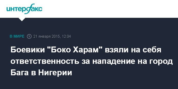 Москва. 21 января. INTERFAX.RU - Лидер исламистской группировки "Боко Харам" Абубакар Шекау заявил, что его боевики совершили атаку на нигерийский город Бага, сообщает в среду The Guardian.