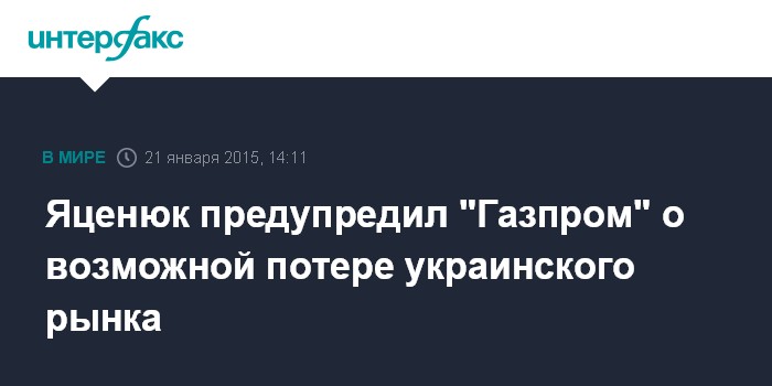 Москва. 21 января. INTERFAX.RU - Украина в декабре 2014 года впервые сократила долю российского газа в газовом балансе страны до 33% и способна уменьшать ее далее, заявил украинский премьер Арсений Яценюк. По его мнению, это может привести к полному отказу от импорта российского газа, если РФ продолжит нынешнюю политику.