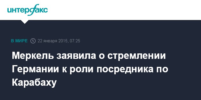 Москва. 22 января. INTERFAX.RU - Германия выступает за мирное урегулирования армяно-азербайджанского конфликта вокруг Нагорного Карабаха и стремится внести личный вклад в достижение этого процесса, заявила канцлер ФРГ Ангела Меркель.