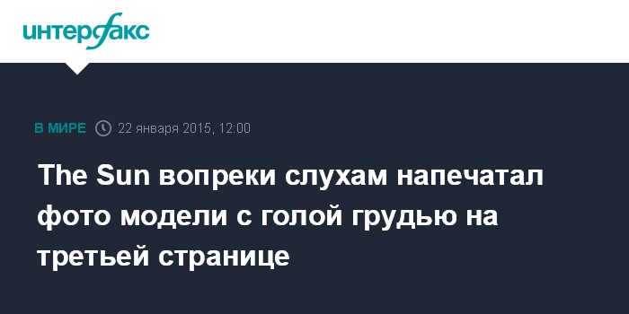 Москва. 22 января. INTERFAX.RU - Британский таблоид The Sun традиционно напечатал на третьей странице фотографию женщины с обнаженной грудью, тем самым опровергнув слухи о закрытии этой рубрики, сообщает BBC.