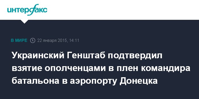 Москва. 22 января. INTERFAX.RU - И.о. пресс-секретаря украинского Генштаба Владислав Селезнев подтвердил, что среди 16 попавших в плен в Донецком аэропорту военнослужащих есть командир батальона.
