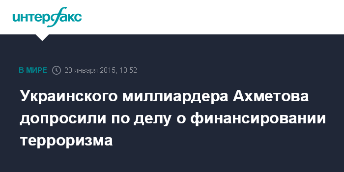 Москва. 23 января. INTERFAX.RU - Украинский бизнесмен Ринат Ахметов был допрошен в качестве свидетеля по делу о финансировании терроризма и незаконных вооруженных формирований, сообщило в пятницу интернет-издание LB.ua.