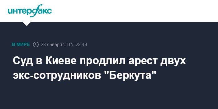 Москва. 23 января. INTERFAX.RU - Коллегия судей Печерского районного суда Киева продлила до 23 марта текущего года срок ареста для двух бывших сотрудников спецподразделения МВД "Беркут" Сергея Зинченко и Павла Аброськина, передает корреспондент "Интерфакса".