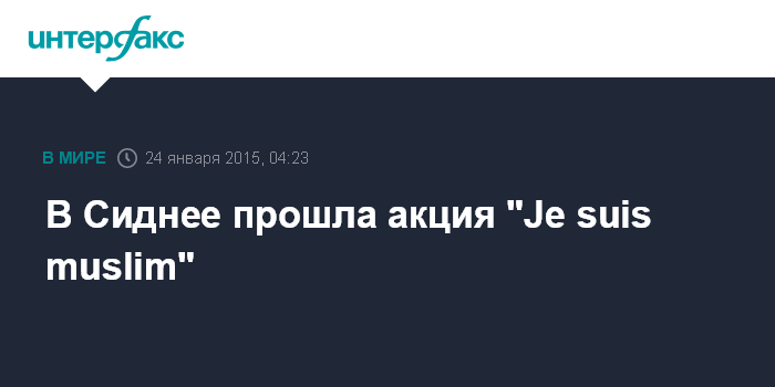 Москва. 24 января. INTERFAX.RU - В пятницу ночью на улицах Сиднея прошла мирная акция протеста "Je suis muslim" ("я мусульманин" - ИФ) , направленная против создания в СМИ негативного образа ислама и продолжающихся публикаций карикатур на пророка Мухаммеда во французском сатирическом журнале Charlie Hebdo. Об этом в ночь на субботу пишет газета The New Zealand Herald.