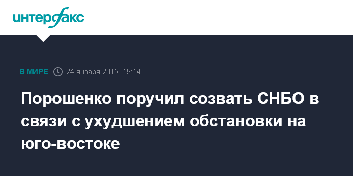 Москва. 24 января. INTERFAX.RU - Совет национальной безопасности и обороны Украины соберется в воскресенье, 25 января, в связи с ухудшением обстановки на востоке Украины, заявил президент Украины Петр Порошенко.