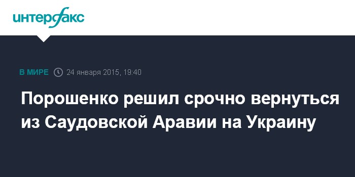Москва. 24 января. INTERFAX.RU - Президент Украины Петр Порошенко срочно возвращается из Саудовской Аравии для проведения заседания Совета национальной безопасности и обороны в связи с обстрелом Мариуполя.