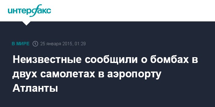 Москва. 25 января. INTERFAX.RU - Военные истребители посадили два коммерческих самолета в американской Атланте, когда правоохранителями была получена информация об угрозе наличия бомб на их борту, сообщила в воскресенье американская телекомпания NBC.