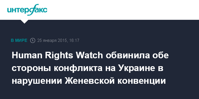 Москва. 25 января. INTERFAX.RU - По данным международной правозащитной организации Human Rights Watch, обе стороны конфликта на юго-востоке Украины нарушают Женевские конвенции, сообщил исполнительный директор правозащитной организации Кеннет Рот в интервью телеканалу Russia Today.
