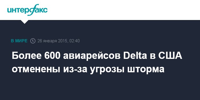 Москва. 26 января. INTERFAX.RU - Авиакомпания Delta в понедельник отменила более 600 своих рейсов в связи с надвигающимся на восточное побережье США снежным штормом, сообщает Sky News.
