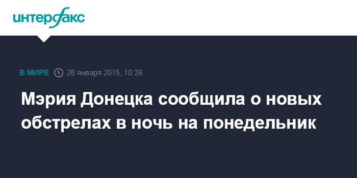 Москва. 26 января. INTERFAX.RU - В мэрии Донецка сообщили, что в ночь на 26 января обстрелы города продолжались. "Ночь в Донецке с 25 на 26 января прошла напряженно, артобстрелу подверглись Петровский и Куйбышевский районы города", - говорится в сообщении.