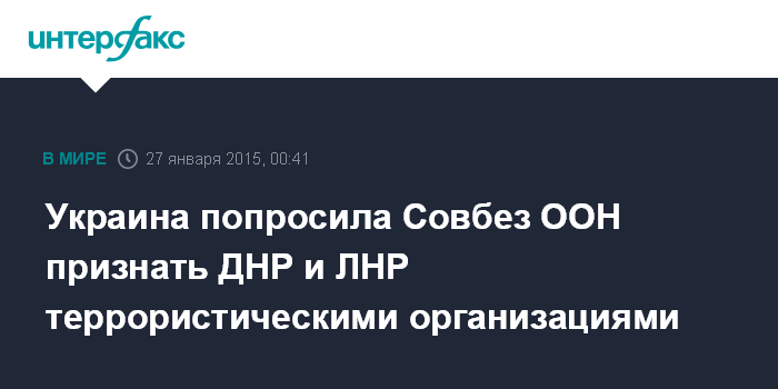 Москва. 27 января. INTERFAX.RU - Украина попросила Совет безопасности ООН признать самопровозглашенные Донецкую и Луганскую народные республики террористическими организациями, а также предпринять эффективные меры по отношению к России, которая спонсирует эти организации, сказал представитель Украины в СБ ООН Юрий Сергеев в ходе внеочередного заседания Совета Безопасности ООН по Украине.