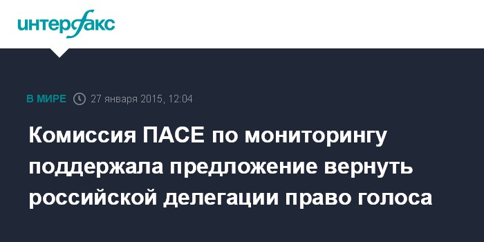 Москва. 27 января. INTERFAX.RU - Комиссия по мониторингу поддержала предложения докладчика по вопросу полномочий российской делегации в ПАСЕ, в частности, о том, чтобы вернуть ей право голоса в Ассамблее, сообщил глава думского комитета по международным делам Алексей Пушков.