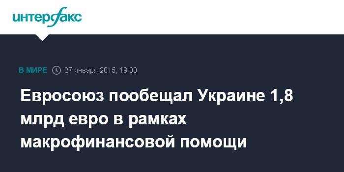 Москва. 27 января. INTERFAX.RU - Совет ЕС по экономическим и финансовым вопросам утвердил во вторник предложение Еврокомиссии о программе макрофинансовой помощи Украине в 1,8 млрд евро, сообщил зампред ЕК Валдис Домбровскис.
