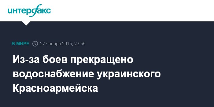 Москва. 27 января. INTERFAX.RU - В результате боевых действий без водоснабжения остался город Красноармейск. Об этом сообщает во вторник пресс-служба Донецкой облгосадминистрации со ссылкой на информацию коммунального предприятия "Вода Донбасса".