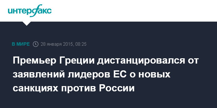 Москва. 28 января. INTERFAX.RU - Новый премьер-министр Греции Алексис Ципрас не поддержал заявления некоторых лидеров стран Евросоюза о готовности к обсуждению и принятию новых ограничительных мер в отношении России.