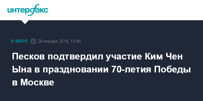 Москва. 28 января. INTERFAX.RU - Северокорейская сторона подтвердила намерение лидера КНДР Ким Чен Ына принять участие в торжествах по случаю 70-й годовщины Победы в Великой Отечественной войне, сообщил "Интерфаксу" пресс-секретарь президента России Дмитрий Песков.