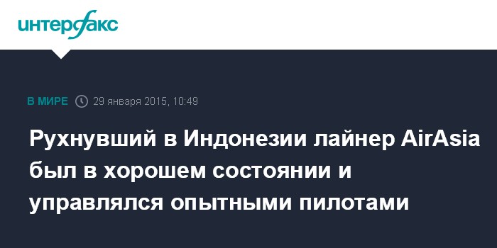 Москва. 29 января. INTERFAX.RU - Лайнер AirAsia, рухнувший у берегов Индонезии в конце декабря, был в хорошем состоянии, а пилоты как следует подготовлены, заявил в четверг национальный комитет Индонезии по безопасности на транспорте.