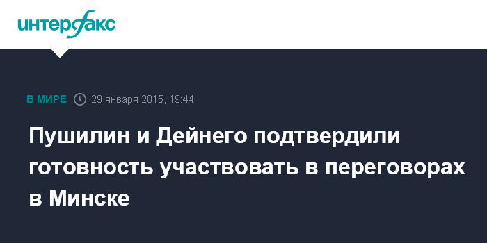 Москва. 29 января. INTERFAX.RU - Полномочные представители самопровозглашенных ДНР и ЛНР на минских переговорах Денис Пушилин и Владислав Дейнего заявили, что готовы участвовать во встрече минской группы 30 января.