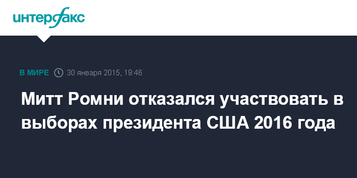Москва. 30 января. INTERFAX.RU - Республиканец Митт Ромни не будет баллотироваться на пост президента США на выборах 2016 года. Об этом говорится в его заявлении, распространенном в пятницу.