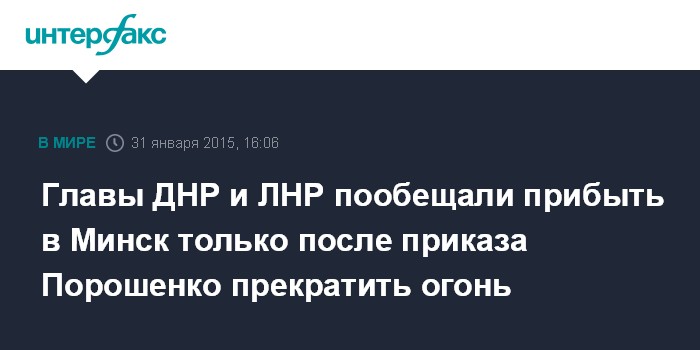 Москва. 31 января. INTERFAX.RU - Главы самопровозглашенных ДНР и ЛНР Александр Захарченко и Игорь Плотницкий не прибудут на переговоры в Минск до тех пор, пока Киев не отдаст публичного приказа о начале перемирия и отводе тяжелого вооружения от фактической линии соприкосновения, заявил в субботу "Интерфаксу" полпред ДНР на переговорах в Минске Денис Пушилин.