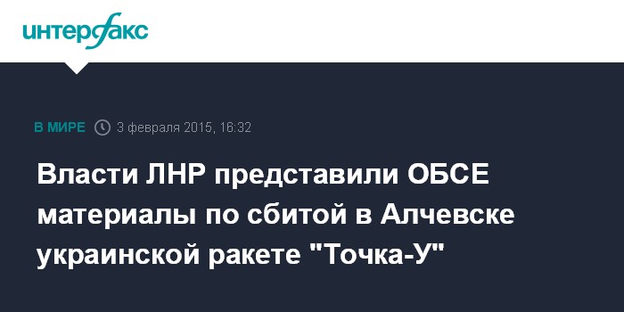 Москва. 3 февраля. INTERFAX.RU - Власти самопровозглашенной Луганской народной республики передали ОБСЕ материалы по сбитой в Алчевске ракете "Точка-У", заявил глава ЛНР Игорь Плотницкий.