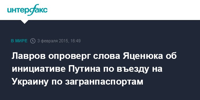 Москва. 3 февраля. INTERFAX.RU - Глава МИД РФ Сергей Лавров назвал неправдой слова премьер-министра Украины Арсения Яценюка о том, что Киев вводит запрет гражданам РФ въезжать на Украину по внутрироссийским паспортам в соответствии с ранее сделанным предложением президента РФ Владимира Путина.